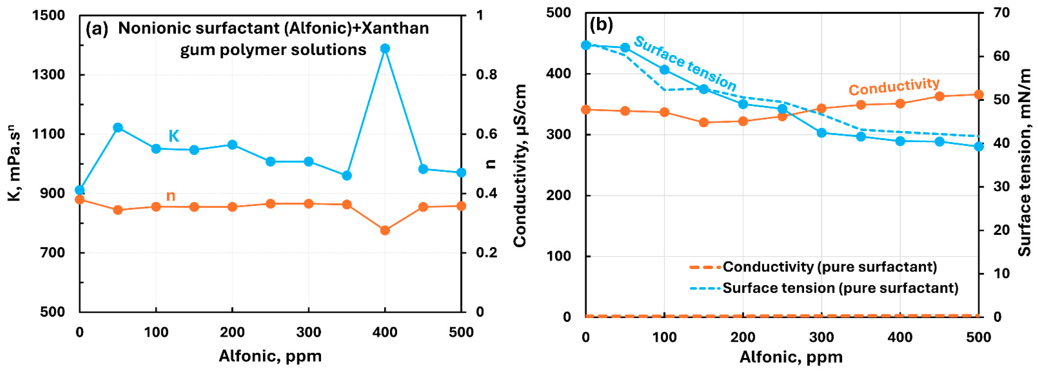 Anionic Xanthan Gum | Nonionic (Alfonic) | S0 P− | Moderate hydrophobic interaction between surfactant and polymer; consistency index generally increases; Surfactant interacts with polymer to forms complexes which are more surface-active than pure surfactant. |