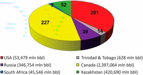 World natural bitumen number of deposits and reserves by 2022 [1,2].