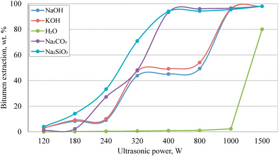 The experimental results showed that an increase in ultrasound power at 22 kHz in all alkaline solutions causes an increase in bitumen yield (Figure 3). At a power level of 1500 W, up to 98 wt.% of bitumen was extracted from the sand. In the case of pure water, bitumen extraction starts when the ultrasound power exceeds 1000 W, reaching a maximum yield of 80 wt.% at 1500 W.