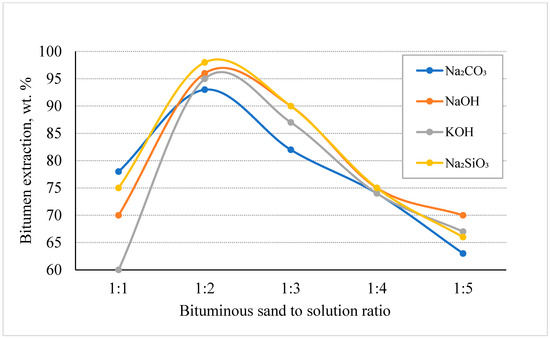 The optimal concentration of NaOH solution was found to be 1 wt.%, and the optimal particle size of bituminous sand was 2.5 mm. Grinding bituminous sand particles down to 1 mm resulted in decreased bitumen extraction efficiency. This may be due to the further particle size reduction caused by high ultrasound power, which leads to intense mixing and the re-agglomeration of extracted bitumen with fine mineral particles. A similar trend was observed for KOH solutions. In contrast, salt solutions exhibited a different behavior: an increase in the concentration resulted in higher extraction degrees. The optimal concentrations for sodium carbonate and sodium silicate solutions were determined to be 12 wt.%.
