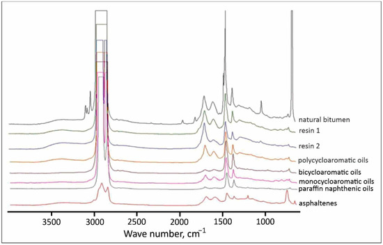 In addition, absorption bands in the 2850–2920 cm−1 region, characteristic of alkyl substituents such as methylene (–CH2–) and methyl (–CH3) groups, are observed. Bands around 1960 cm−1 indicate the presence of C=C=C allyl groups. Notably, relatively intense bands at approximately 1705 cm−1 correspond to C–O–C and C–OH groups, which are peculiar to carboxyl functionalities [33]. These bands are due to aromatic compounds containing C=O groups, showing a higher degree of oxidation in these bitumen components.