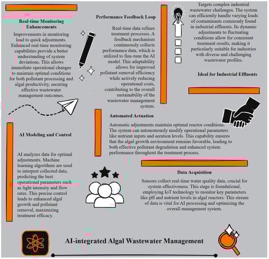 Conventional wastewater treatment methods typically achieve 70–90% removal efficiency for organic pollutants. However, the global wastewater crisis—with 80% of wastewater discharged untreated—demands innovative solutions to overcome persistent challenges in nutrient removal and resource recovery. This review presents the first systematic analysis of technology integration strategies for algal wastewater treatment, examining synergistic combinations of biofilm reactors, nano-enhancement, artificial intelligence, and 3D printing technologies. Individual technologies demonstrate distinct performance characteristics: algal biofilm reactors achieve 60–90% removal efficiency with biomass productivity up to 50 g/m2/day; nano-enhanced systems reach 70–99% pollutant removal; AI optimization provides 15–35% efficiency improvements with 25–35% energy reductions; and 3D-printed architectures achieve 70–90% removal efficiency. The novel integration framework reveals that technology combinations achieve 85–95% overall efficiency compared to 60–80% for individual approaches. Critical challenges include nanomaterial toxicity (silver nanoparticles effective at 10 mg/L), high costs (U.S. Dollar (USD) 50–300 per m2 for 3D components, USD 1500+ per kg for nanomaterials), and limited technological maturity (TRL 4–5 for AI and 3D printing). Priority development needs include standardized evaluation metrics, comprehensive risk assessment, and economic optimization strategies. The integration framework provides technology selection guidance based on pollutant characteristics and operational constraints, while implementation strategies address regional adaptation requirements. Findings support integrated algal systems’ potential for superior treatment performance and circular economy contributions through resource recovery.