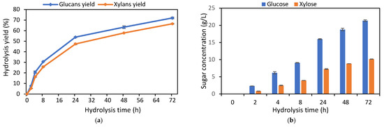 Kinetics of hydrolysis yield (a) and fermentable sugars (b) released from pretreated bagasse (with antibiotics addition). Error bars indicate the standard deviation from three independent replicates.