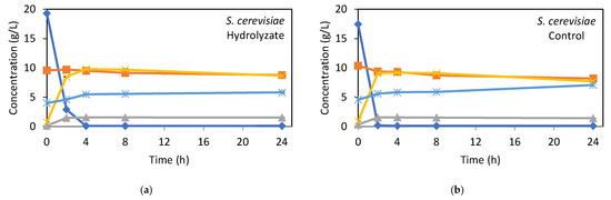 The hydrolysate fermentation was carried out using S. cerevisiae PE-2 and S. stipitis CBS 5773. For the inoculum, S. cerevisiae was pre-grown in a medium composed of sucrose (20 g/L), yeast extract (2.5 g/L), urea (0.6 g/L), K2HPO4 (0.87 g/L), MgSO4·7H2O (0.49 g/L), ZnSO4·7H2O (0.029 g/L), MnSO4·H2O (0.017 g/L), and pH = 5.5. S. stipitis was pre-cultured in the same culture medium except for sucrose which was replaced by xylose. Both yeasts were pre-cultured for 72 h at 30 °C after which they were recovered through centrifugation (Hettich ROTANTA 460, Tuttlingen, Germany) at 3000 rpm, 4 °C, 10 min, and washed once with sterile buffer. The fermentation was carried out taking as control a semisynthetic medium containing glucose and xylose at amounts equivalent to those found in the hydrolysate. Both the hydrolysate and the control medium were enriched with the components present in the preculture medium at the same concentrations, except for fermentable sugars, and then autoclaved at 0.5 bar for 10 min. The inoculum cell pellets were resuspended in the fermentation media and transferred into 125 mL Erlenmeyer flasks with a working volume of 30 mL with a starting concentration of about 3 to 4 g/L yeasts. For each sampling time, three independent assays were prepared for each yeast, which were kept in an orbital incubator for 24 h at 100 rpm. Samples for analysis, retrieved after 0, 2, 4, 8, and 24 h, were cooled in the ice bath and centrifuged (HT 80-2B, Huanghua Faithful Instrument, Huanghua, China) for 10 min at 3000 rpm. The obtained supernatant was frozen for further analysis of ethanol, glycerol, acetic acid, and glucose by HPLC as described above in Section 2.2 [28]. The cell pellet was rinsed twice with sterile buffer, resuspended in a defined buffer volume, and then used for biomass quantification by measuring optical density at 600 nm, based on a previously established standard curve.