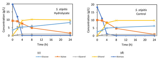 As shown in Figure 2c,d after glucose depletion, S. stipitis fermented xylose, leading to an increase in ethanol concentrations up to 8 h, though the conversion was less efficient than glucose fermentation. This could be due to a metabolic shift from ethanol or xylitol synthesis toward cell growth, as reported for C. guilliermondii when xylose concentrations dropped below 50 g/L [50]. Silva et al. [28] also demonstrated that S. stipitis requires tight oxygen control to maintain xylose conversion to ethanol or xylitol, which was not achievable in the shaker flask used in this study. The continuous increase in S. stipitis biomass likely resulted from this metabolic shift. Additionally, after glucose depletion, ethanol was metabolized while xylose was still being consumed, as also noted by Guo et al. [48] and Schirmer-Michel et al. [51] in other pentose-metabolizing yeasts.