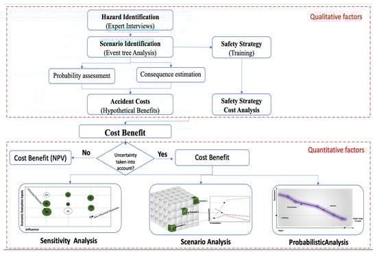 Over the past decades, cost–benefit analyses and their specific application to the field of safety have been extensively examined. The predominant method for the economic evaluation of interventions in Occupational Safety and Health (OSH) studies is cost–benefit analysis (CBA), which is particularly well-suited for this field. A comprehensive economic evaluation—the only kind that yields legitimate insights about efficiency—involves identifying, measuring, and valuating both the costs and consequences. This approach is essential as it facilitates the comparison of effectiveness and benefits across multiple interventions []. Chen et al. proposed a methodology aimed at preventing and mitigating intentional domino effects, incorporating economic considerations into safety and security decision-making. The approach is structured into five components: threat analysis, vulnerability assessment of installations against intentional attacks, vulnerability assessment of installations susceptible to domino effects, cost–benefit analysis, and optimization. The analysis uses the Net Present Value of Benefits (NPVB) to assess whether a particular protection strategy, combining safety and security measures, is economically viable []. In a separate study, Valeria Villa et al. introduced a new model for conducting cost–benefit and cost-effectiveness analyses specifically for counter-terrorism measures in the process industry. This model begins with assessing the baseline effectiveness of a facility’s physical protection system and allows for comparison between the costs of security upgrades and the potential losses from both anticipated and retrospective accidental events, defined as benefits, while also accounting for improvements in system effectiveness. The model supports more rational and efficient selection and allocation of physical security measures within the process industry [].
