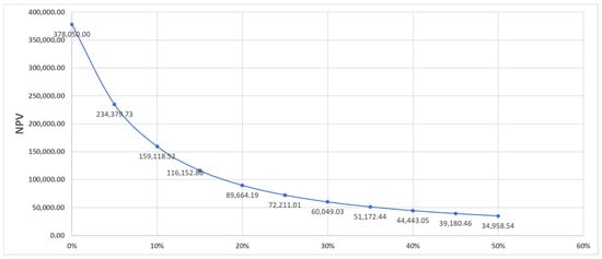 NPV signifies the net cash flow after discounting. In essence, NPV is calculated by deducting the discounted expected costs of the investment from the discounted value of the expected benefits []. An investment is deemed profitable when the cumulative Net Present Value (NPV) of all associated cash flows is positive, whereas it is typically rejected if the NPV is negative [].