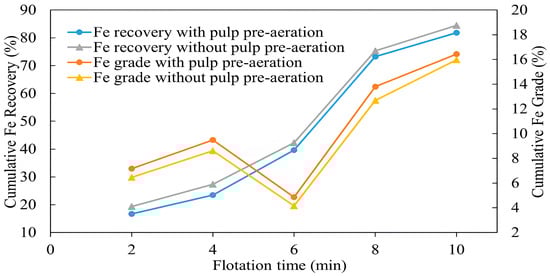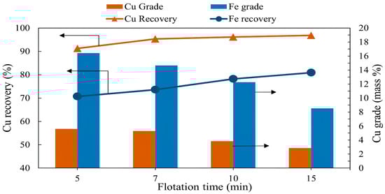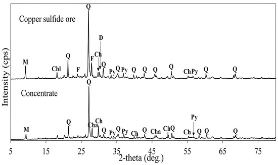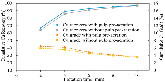 Copper sulfide ores often contain significant amounts of silica and sulfur-bearing gangue minerals, complicating flotation efficiency. However, these challenges can be mitigated through collectorless flotation, which exploits the natural floatability of chalcopyrite and the hydrophilicity of silica minerals. Pyrite, the main sulfur gangue mineral, is also depressed under these conditions, improving concentrate quality by reducing the sulfur and iron content. Air exposure and pulp pre-aeration techniques can enhance chalcopyrite floatability, resulting in high recovery and grade. However, further processing of chalcopyrite concentrate using direct leaching remains challenging due to sulfur passivating layers. To overcome this, additive roasting is used as a pretreatment to improve the leachability of chalcopyrite. This study explored a combined collectorless flotation and additive roasting-leaching method using copper sulfide ore with chalcopyrite, quartz, and pyrite as the main minerals. Collectorless flotation achieved 94.5% recovery and a concentrate of 7.12% Cu from an initial 0.94%. Roasting this concentrate with additives like KCl and NaOH at 600 °C for 1 h, followed by leaching in 0.1 M H