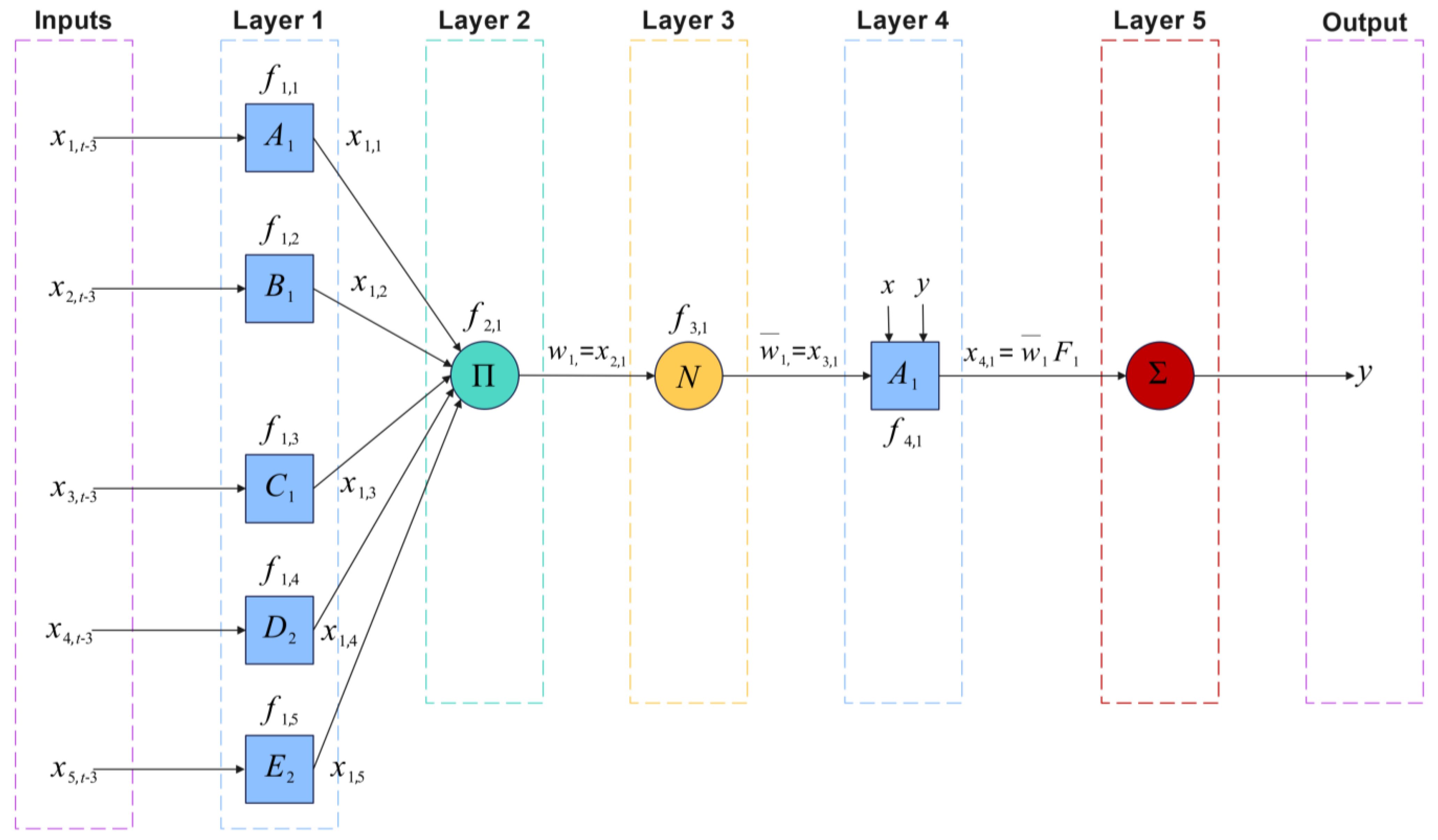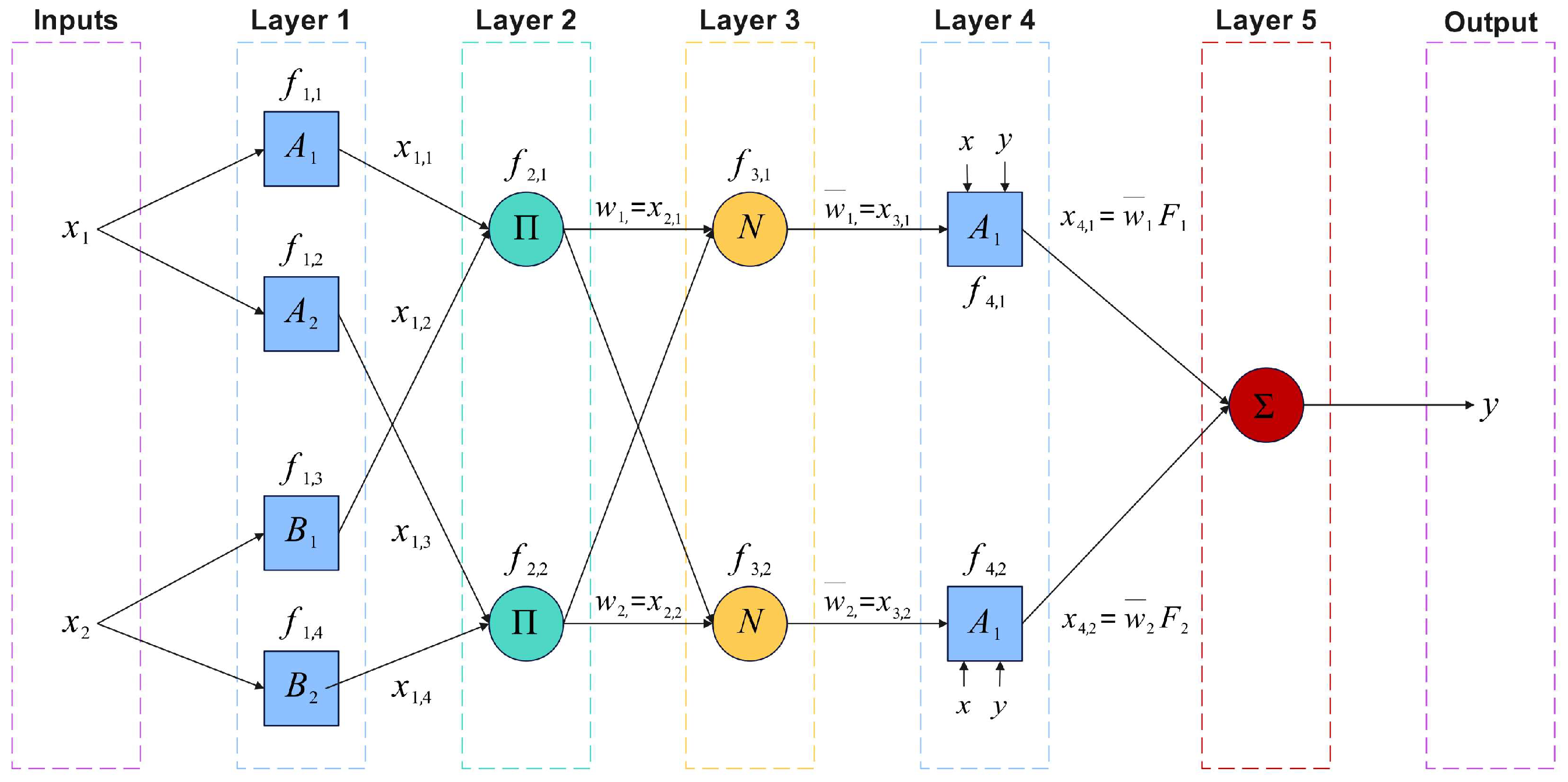 - Layer 3 (Normalization): Normalizes firing strengths: