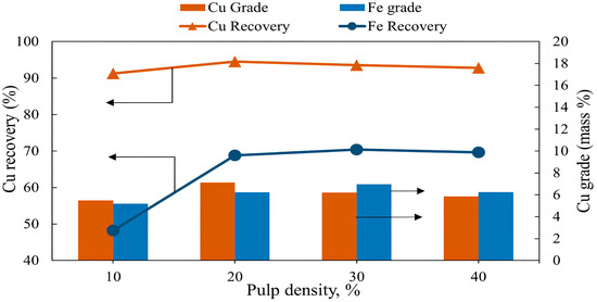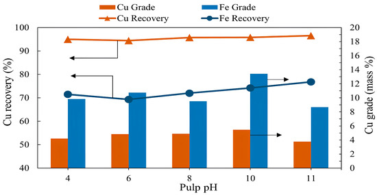 | Parameters | Conditions | Cu Recovery,% | Cu Grade, Mass% |