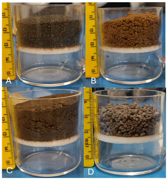 Pictures showing the distribution of particles for each bed in the quartz reactor. (A) = the magnetite concentrate, (B) = the hematite ore, (C) = the hematite–goethite ore and (D) = Sinter fines.