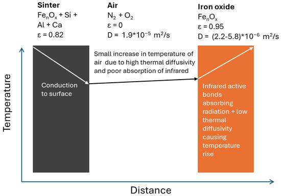 The bed materials have a thermal conductivity of 1.5–5.98 W/mK and thermal diffusivities of 2.2 × 10−6–5.8 × 10−6 m2/s, whereas air has a thermal conductivity of 0.024 W/mK and a thermal diffusivity of 1.9 × 10−5 m2/s. Figure 11 shows how energy moves from sinter, through a pore and into the bed material, taking into account the infrared and conductive properties of each material. Figure 12 shows how energy is transferred through direct conduction from the lump sinter to the bed material; the thermal conductivity of both materials is similar, allowing temperature to flow quickly across the boundary. Preferential conduction through the bed materials causes conduction around pores, creating tendrils in the image analysis. The emissivity of the bed materials is also high (Table 5), allowing the bed materials to radiate through pores and heat neighbouring bed materials. The difference in thermal properties of lump sinter, air and the bed materials show how isolated hotspots in the image analysis (Figure 13) from the bed material heats faster than the air in the pore.