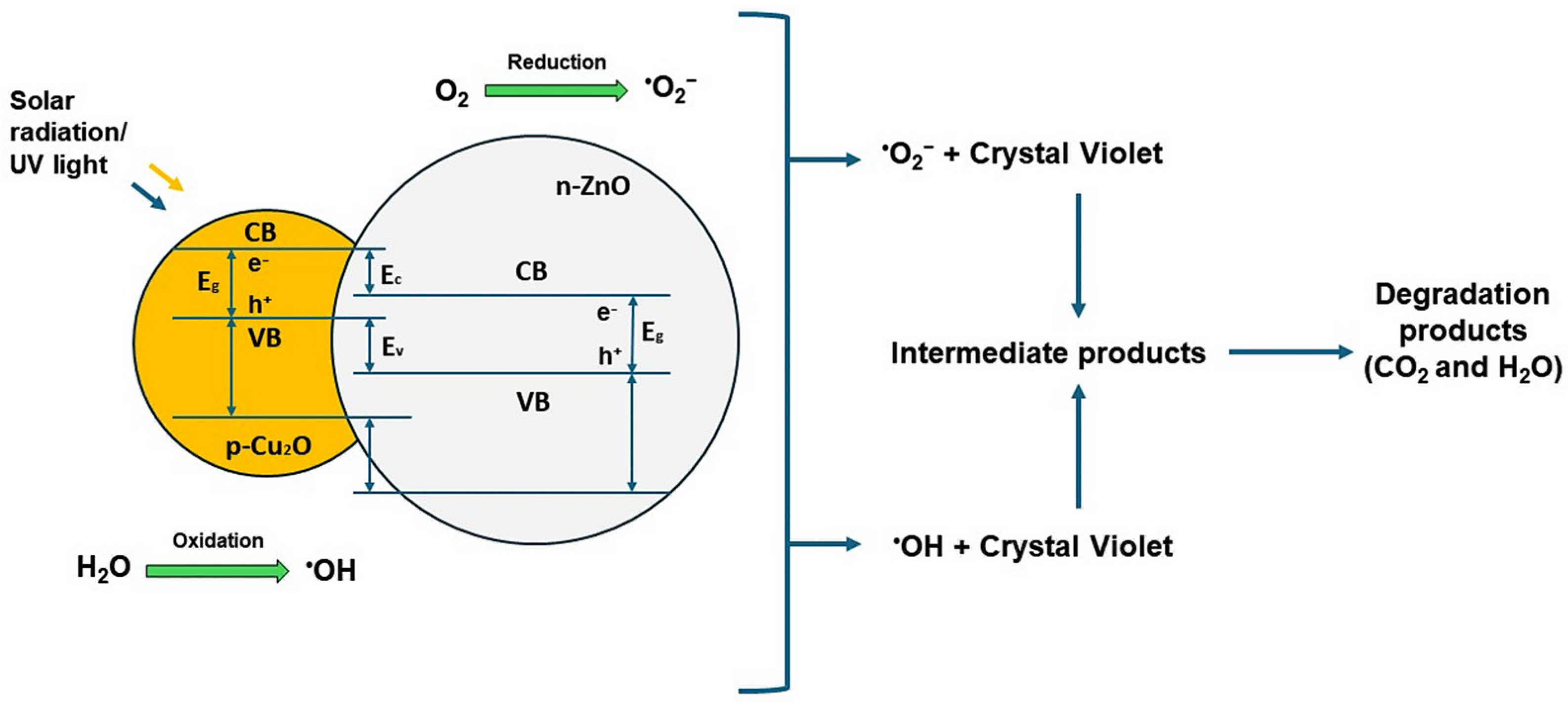 - Modifications of ZnO (doping and forming heterostructures with Cu2O) to enhance visible-light absorption and reduce charge carrier recombination.