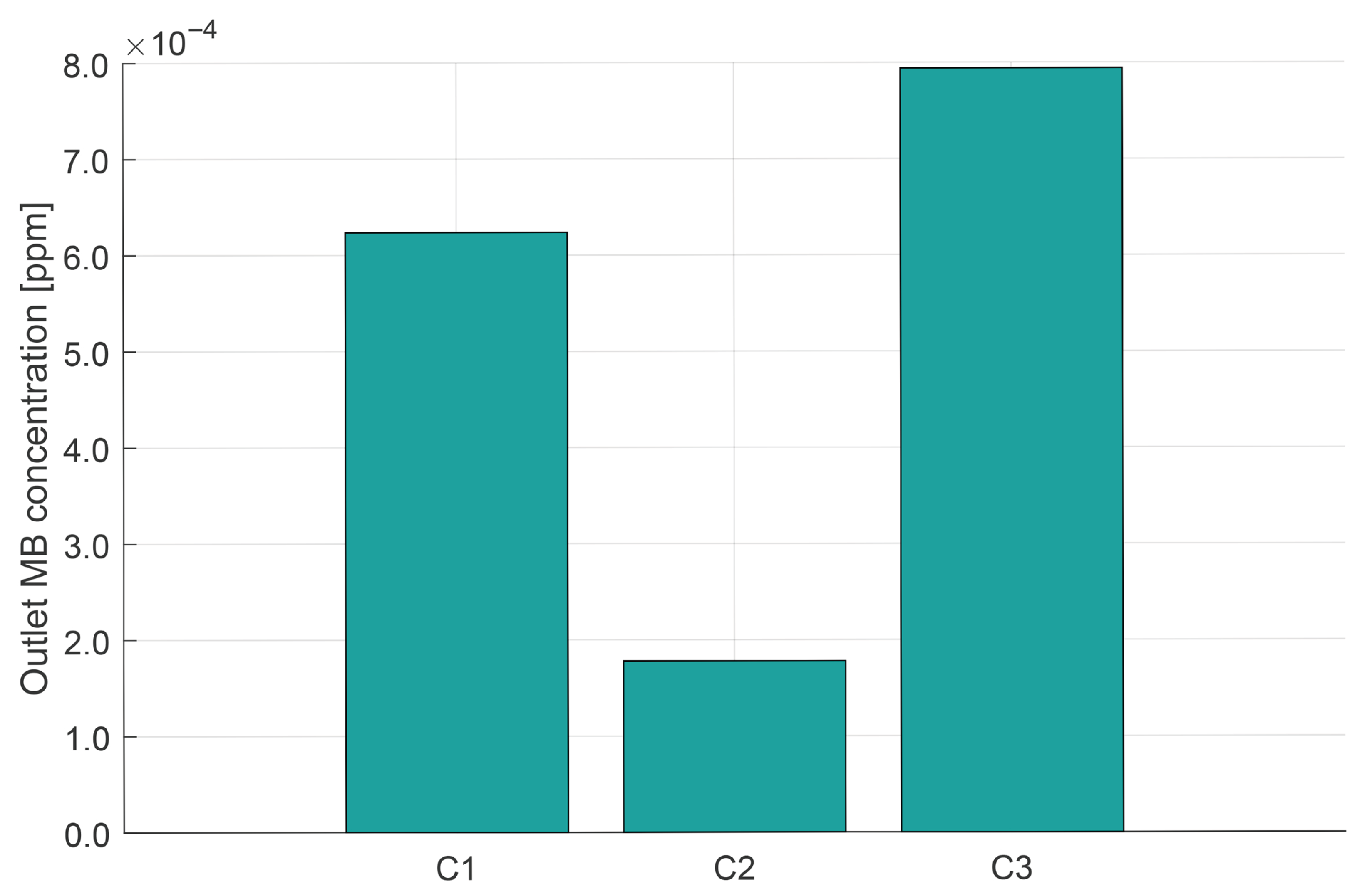 3.2. Case Study of MB Ozonation, Conversion and Ozone Distribution as a Function of Geometry