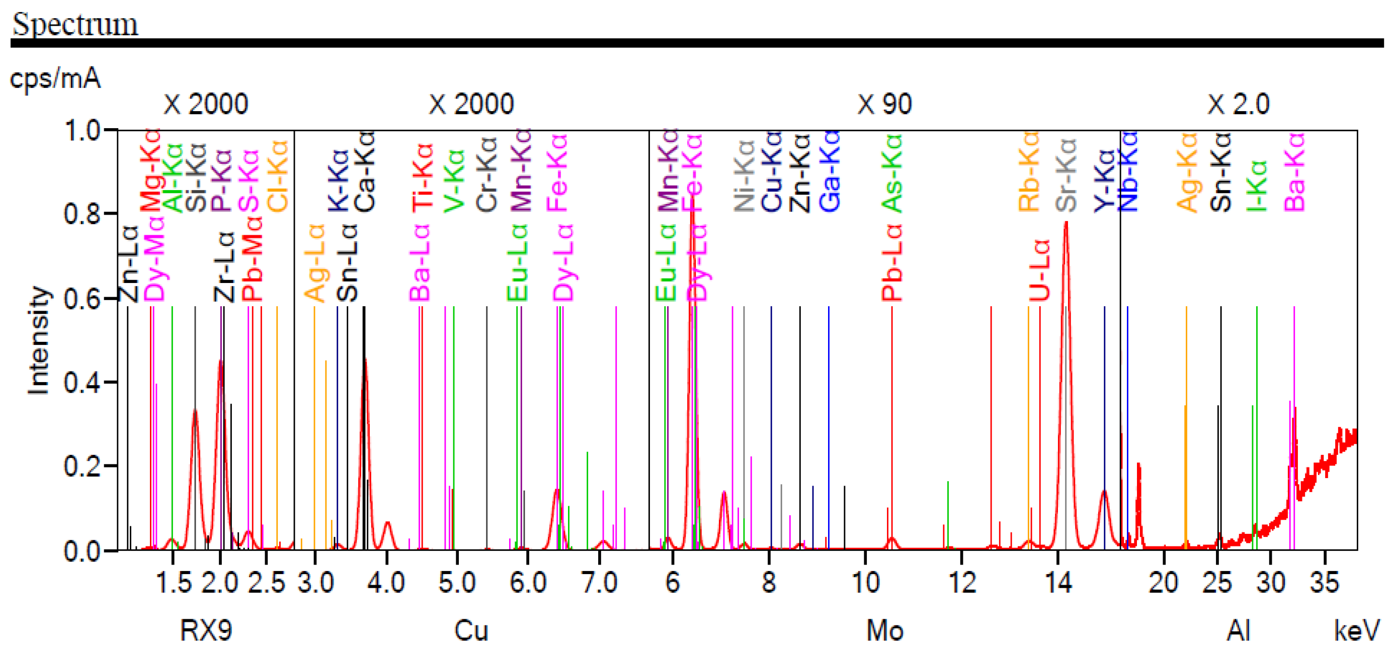 The spectrum of X-ray fluorescence (XRF) analysis of the phosphate-siliceous shale of the Janatas deposit shows a typical multicomponent emission pattern reflecting its complex mineralogical composition (