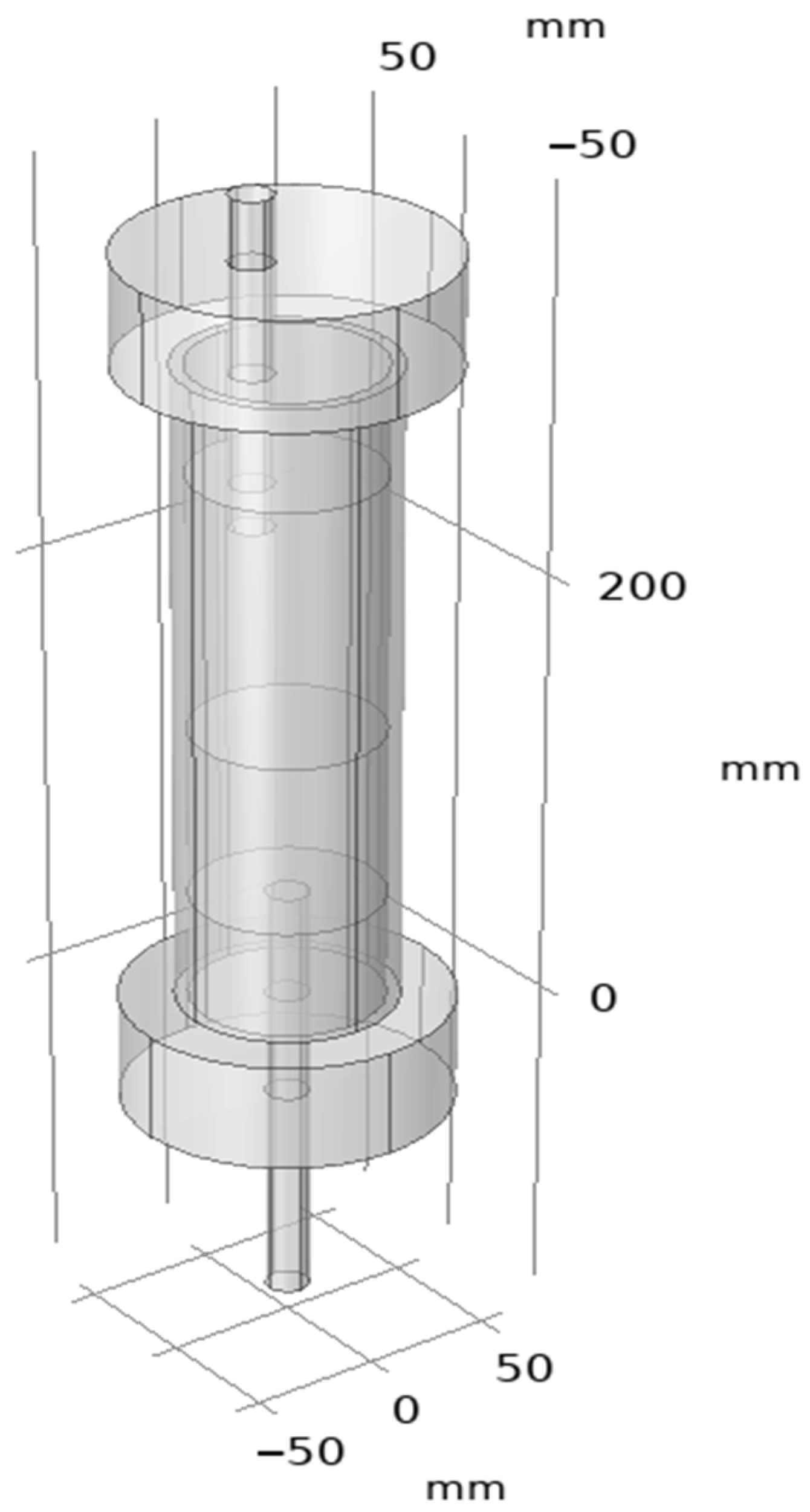 Both interfaces are connected through the velocity field of the gas coming from below and passing through the porous loading. Thus, the model implements a multiphysical relationship between hydrodynamics and heat transfer, which makes it possible to reliably describe the distribution of temperature, pressure, and velocity inside the furnace’s working area. The calculations were carried out in steady-state mode, with the appropriate boundary conditions set at the inlet, outlet and walls of the reactor.