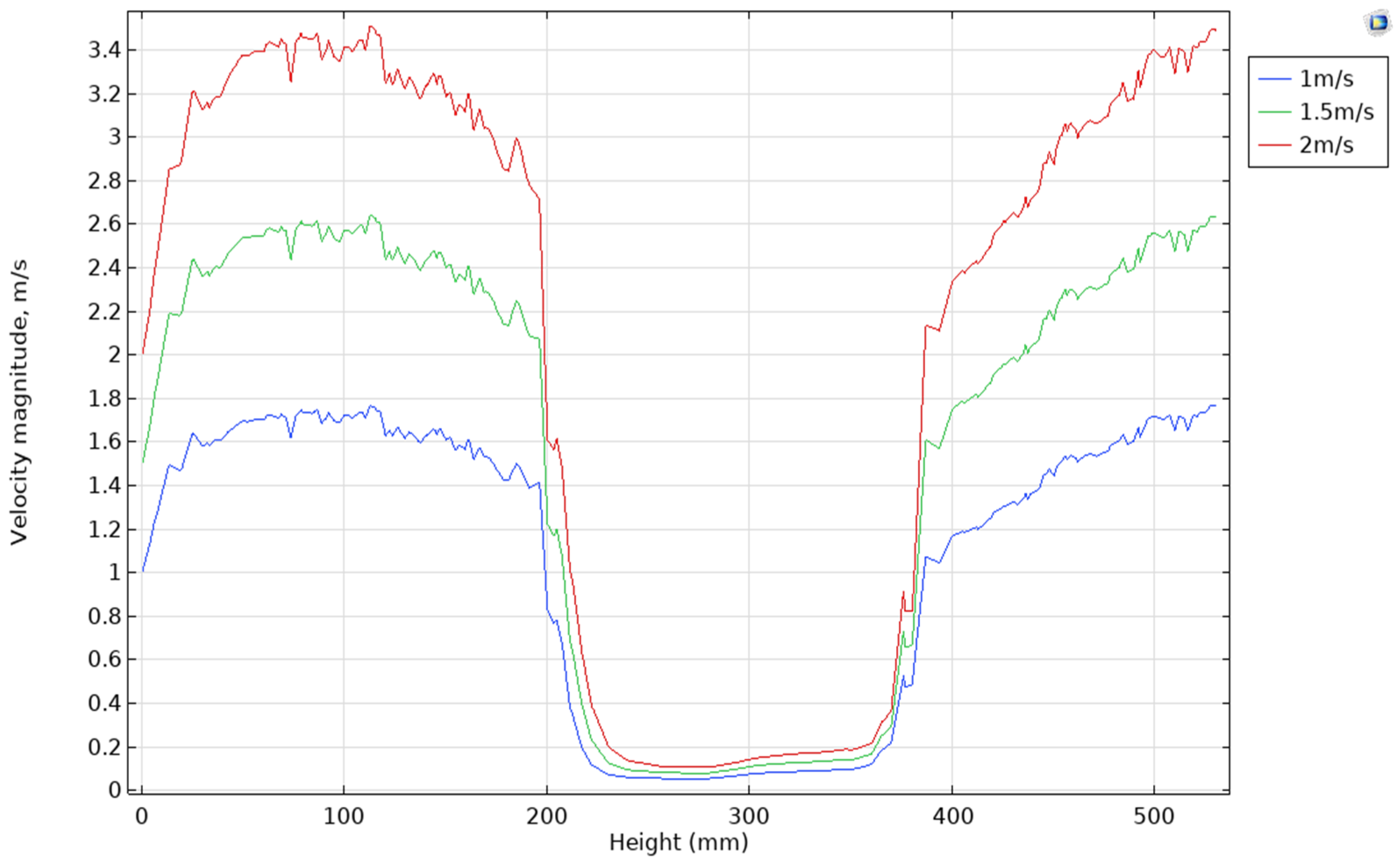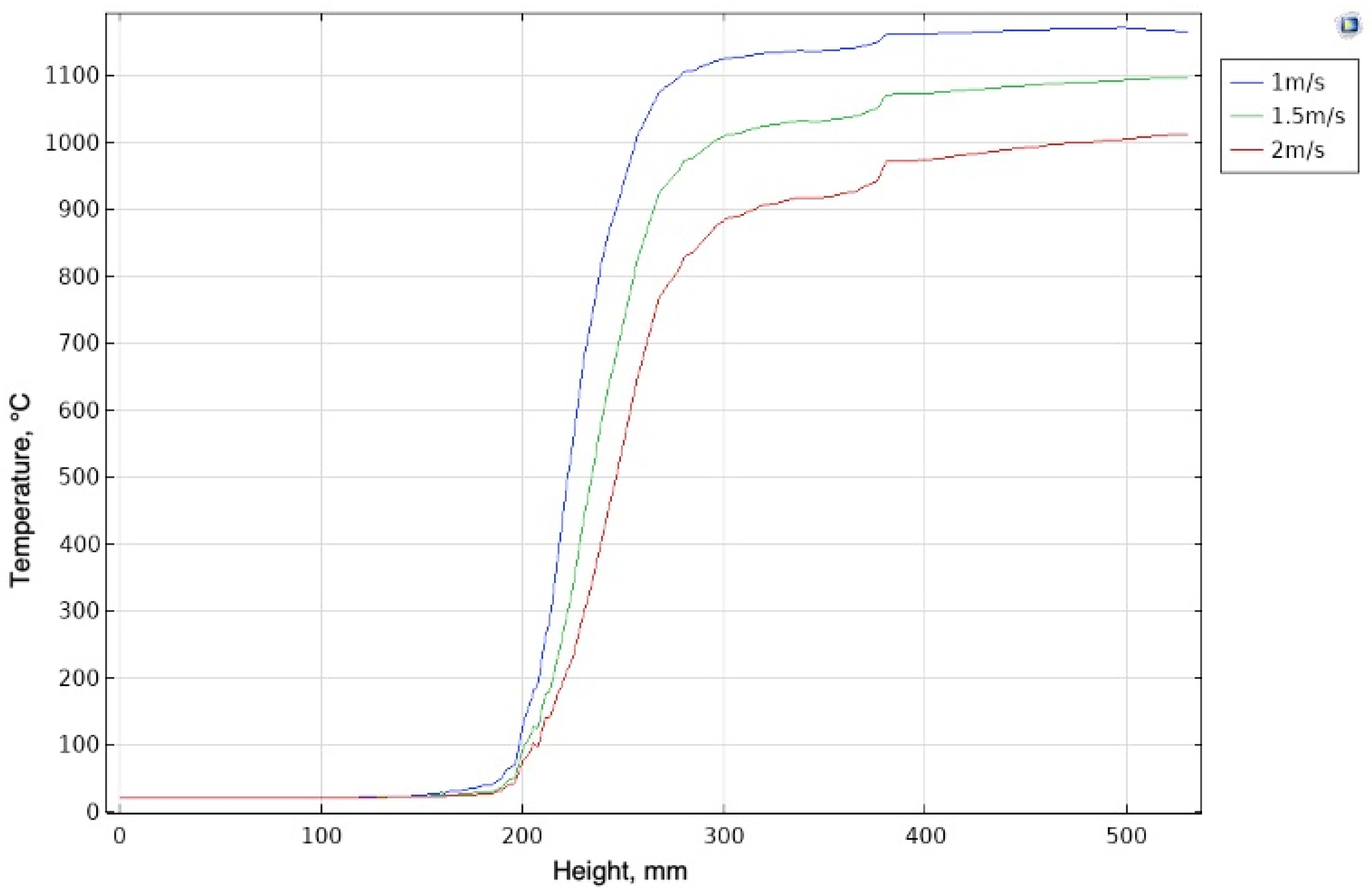 Figure 5 shows the distribution of the gas velocity modulus in the cross-section of an agglomeration furnace. After entering the porous medium, there is a sharp decrease in the gas velocity caused by the resistance of the charge structure. The gas is filtered through the porous structure of the charge, and the velocity in the central part of the layer decreases to 0.01–0.03 m/s even at an inlet velocity of 1–2 m/s. The velocity increases as you move up in the height of the layer between 180 and 460 mm, reaching a local maximum in the upper part of the layer up to 260 mm due to the partial expansion of the channels and a decrease in resistance as you warm up (