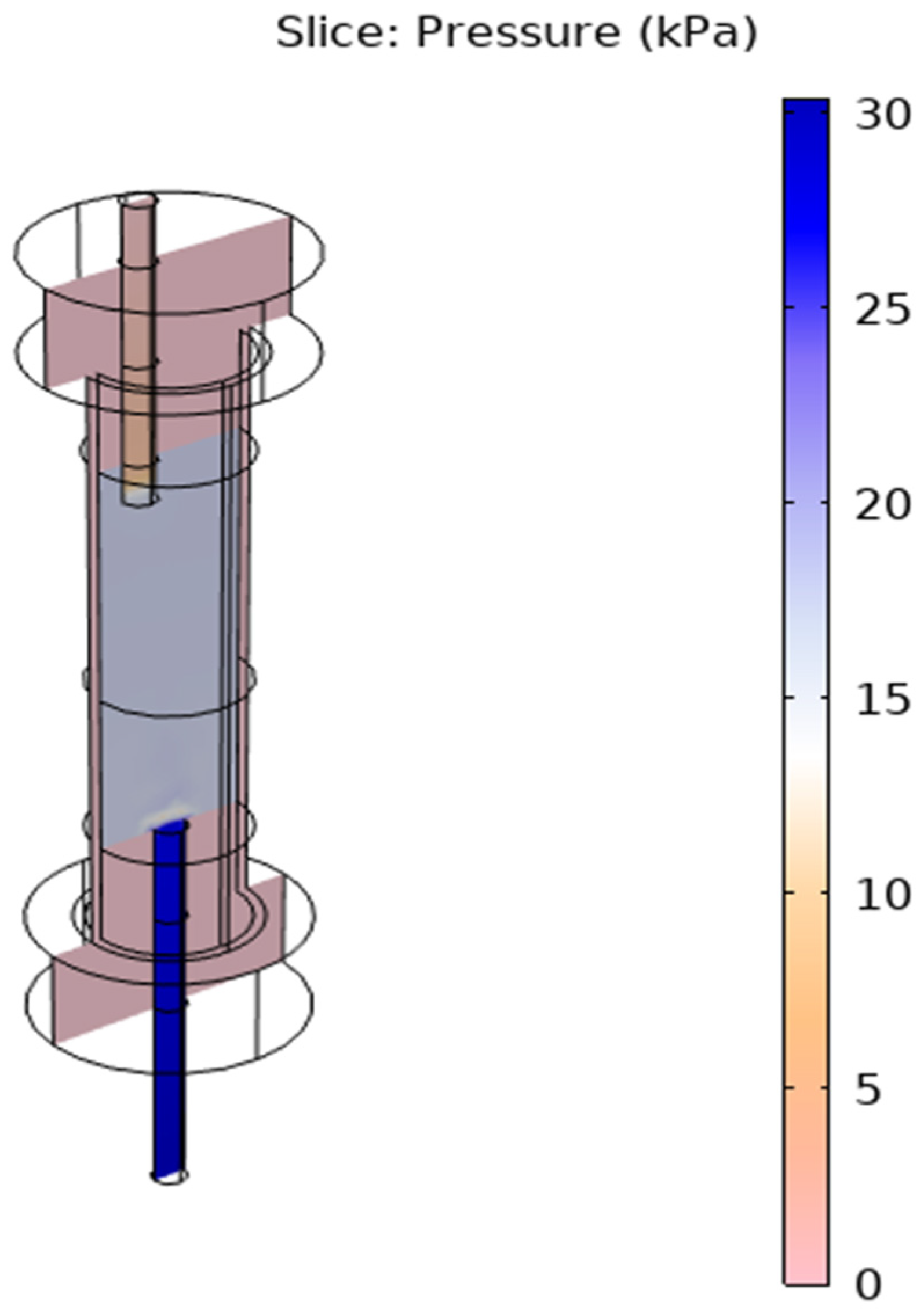 Figure 8 shows the pressure distribution over the reactor cross-section, which shows a clearly defined gradient inside the charge. The maximum pressure of up to 30 kPa is fixed at the entrance to the porous layer, after which it gradually decreases in the direction of exit to 5 kPa.