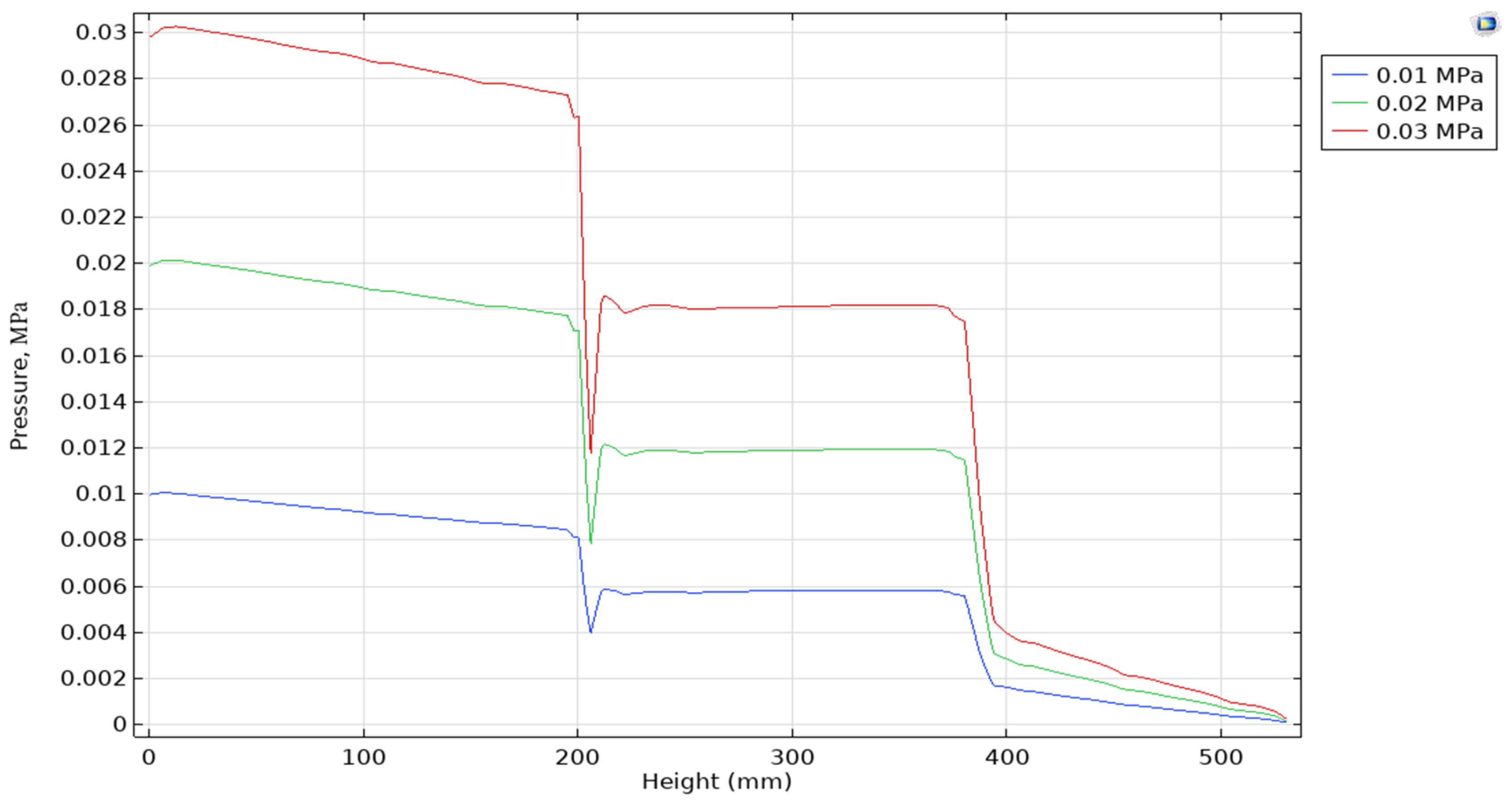Figure 8, there is a gradual decrease in gas pressure in the area up to 200 mm, which is caused by the laminar flow of gas in a free volume. Starting from 200 mm, there is a sharp pressure jump, which corresponds to the beginning of a porous medium. In the charge layer, the pressure change occurs linearly, which is consistent with the Darcy’s law flow model. This indicates the uniformity of the charge structure and a stable pressure gradient in the filtering medium.