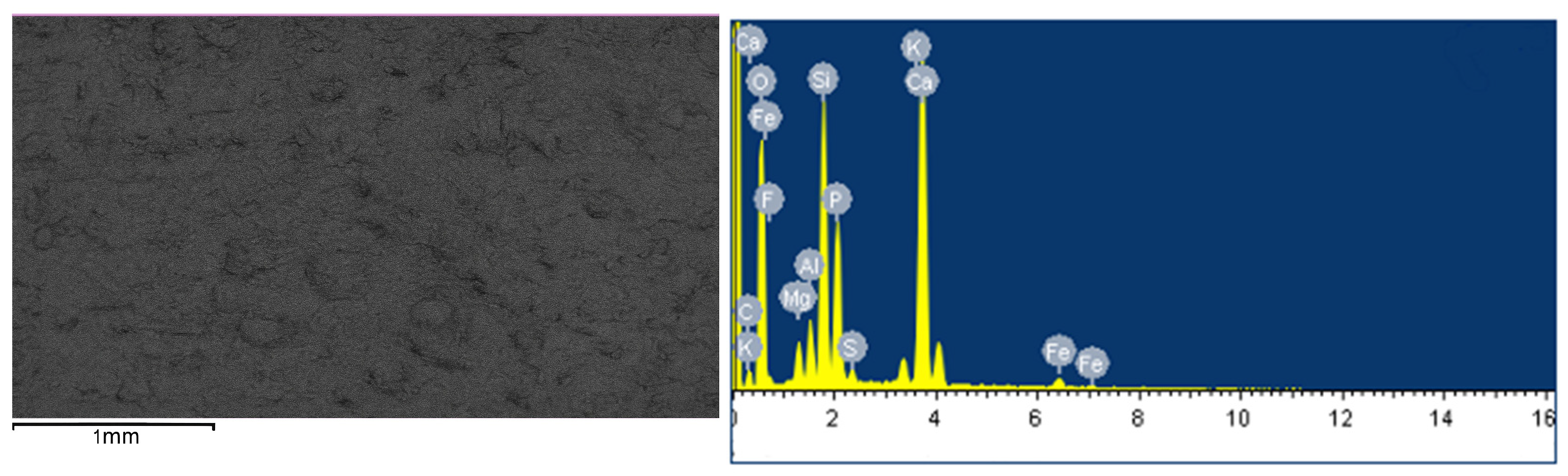 Intense fluorescence peaks relate to calcium: the main Ca Kα1 line was recorded at 3.690 keV, and its satellite Ca Kß at 4.012 keV. The intensity of these bands is twice as high as all other elements, which indicates the dominant content of calcium minerals, carbonates and phosphates. The next peaks in intensity are lines of phosphorus P Kα1 (~2.013 keV) and P Kß (~2.150 keV), which confirms the significant presence of phosphate phases. The distinct sharp lines of silicon: Si Ka1 at 1.740 keV and Si Kß at about 1.839 keV indicate the predominance of silica, quartz, and amorphous SiO2 in the rock. Along with silicon, aluminum Al Ka1 (1.486 keV) and Al Kß (1.557 keV) characterize the admixture of clay aluminosilicates. The less intense peak activity of transition metals: iron Fe Ka1 (6.404 keV) and Fe Kß (7.058 keV), indicates the presence of siderite and hematite impurities in the structure. The less pronounced lines of the metallic components indicate small inclusions of these elements in the form of latent oxides.