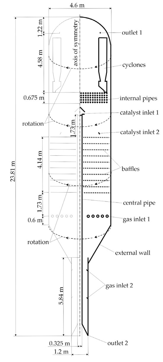 A model of an industrial reactor with a fluidized catalytic bed is presented. Previous studies [37,38] analyzed an industrial reactor model based on parameters from an operational unit. This work extends this approach by developing a reactor model with different geometric parameters and incorporating additional internal components. Figure 2 shows the schematic of the industrial reactor model, including its main dimensions and design elements.