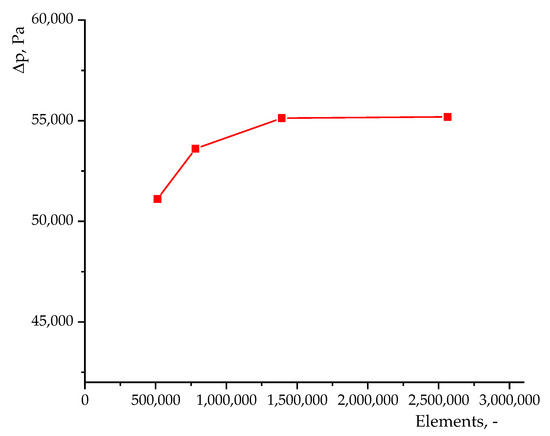 Particles that entered the outlet surface at the top of the reactor are returned to the working area through the cyclones, where the “mass-flow inlet” condition was specified. In the constructed model, the “mass-flow inlet” conditions were specified in the cyclone outlet channels in accordance with the catalyst flow through the outlet channel at the top of the reactor. This cyclone model is a simplification. Here, particles entering the “outlet 1” boundary are immediately returned to the reactor above the upper baffle. In a real cyclone, the catalyst particle will move for some time. During this time, even the smallest particles may be carried out of the cyclone. The model implemented in this study greatly idealizes cyclone operation. However, constructing a more accurate cyclone simulation model requires a separate study examining cyclone operation under different gas and particle loads. If these studies can yield relationships between particle entry into the cyclone and their injection, this model can be used in further studies for more accurate simulation.