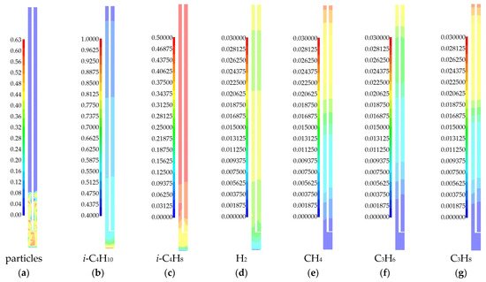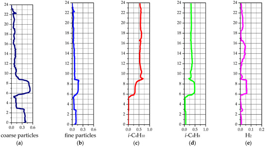 Preheated isobutane is introduced into the lower section via a multilayer porous distributor, which ensures uniform flow distribution and prevents catalyst particles from entering the gas supply pipe. The process employs a granulated chromia/alumina catalyst [59,60,61,62,63]. Experimental data were obtained under the following conditions: solid particles mass of 100 g, gas temperatures of 550–625 °C, gas velocity of 0.016 m/s.