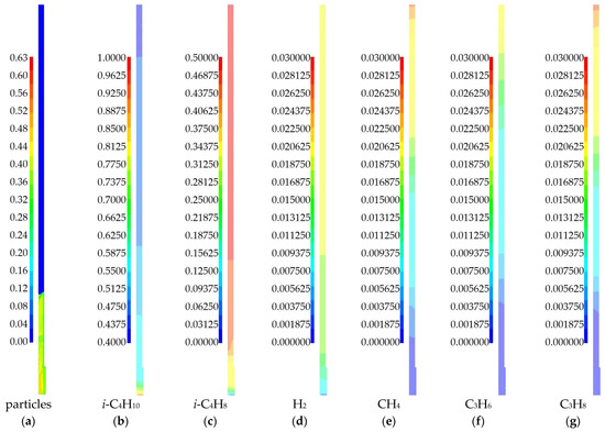 The “mass-flow inlet” conditions were set for the gas feed in the laboratory and industrial reactor models. In the laboratory reactor model, we often talk about the gas velocity. This is due to the fluidized bed hydrodynamics, where many parameters depend on the gas velocity. In the CFD simulation, we used the gas mass-flow condition. From the gas mass-flow, we can calculate the gas velocity for the fluidized bed hydrodynamics analysis. In the industrial reactor, a continuous catalyst feed from the regenerator is also set. There, the “mass-flow” inlet condition is also set. More detailed information about the gas and solid phases at the reactor feed boundary is presented in Table 3.