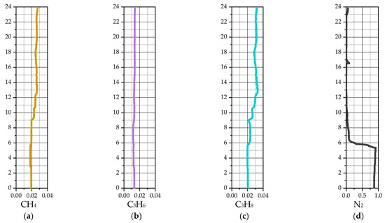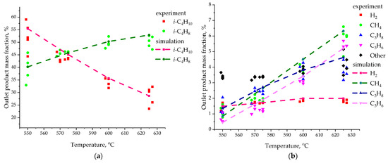 Experimental data were generated using the setup described in [61,63]. The dehydrogenation cycle comprised the following steps: 40 min of dehydrogenation, 5 min of nitrogen purging, 30 min of air regeneration at 650 °C, and another 5 min of nitrogen purging. This cycle was repeated continuously for 16 cycles. During dehydrogenation, gas samples were collected at 20 and 40 min intervals. Two distinct gas chromatography (GC) methods were employed for compositional analysis. Hydrocarbon species in the feedstock and products were separated using a GH-1000 instrument (Khromos, Dzerzhinsk, Russia) featuring a VP-Alumina/KCl capillary column (VICI Valco, Houston, TX, USA) and detected with a flame ionization detector. Conversely, the levels of H2, CH4, and CO were measured on a separate GH-1000 system fitted with a thermal conductivity detector and a 13X molecular sieves packed column. The averaged experimental data are summarized in Table 1.