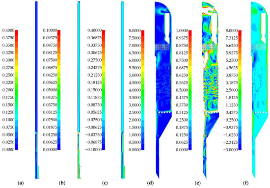 Over the past decade, researchers have actively employed CFD simulations to model large-scale industrial reactors or their key components. A two-fluid model was developed in [34] to simulate an industrial fluidized-bed olefin polymerization reactor with a height of 5 m and a diameter of 1 m. The calculated average voidage of the layer shows strong correlation with experimental results. However, this model only accounted for particle motion without considering heat and mass transfer. Significant attention was devoted to simulating polydisperse particles. In their subsequent work [35], the authors employed an Eulerian-Lagrangian approach to simulate polydisperse particle motion in a fluidized bed reactor with greater accuracy. The study in [36] simulated a large-scale circulating fluidized bed furnace with various gas–solid drag models and validated the simulation results against experimental measurements. Although the model shows a significant difference from measured data in predicting the riser’s vertical solids distribution, it successfully represents the annulus flow structure. The velocities of the downdraft and updraft are qualitatively realistic. These results were achieved using subgrid-scale models that were derived to modify the interphase momentum exchange coefficient solely based on volume fraction.