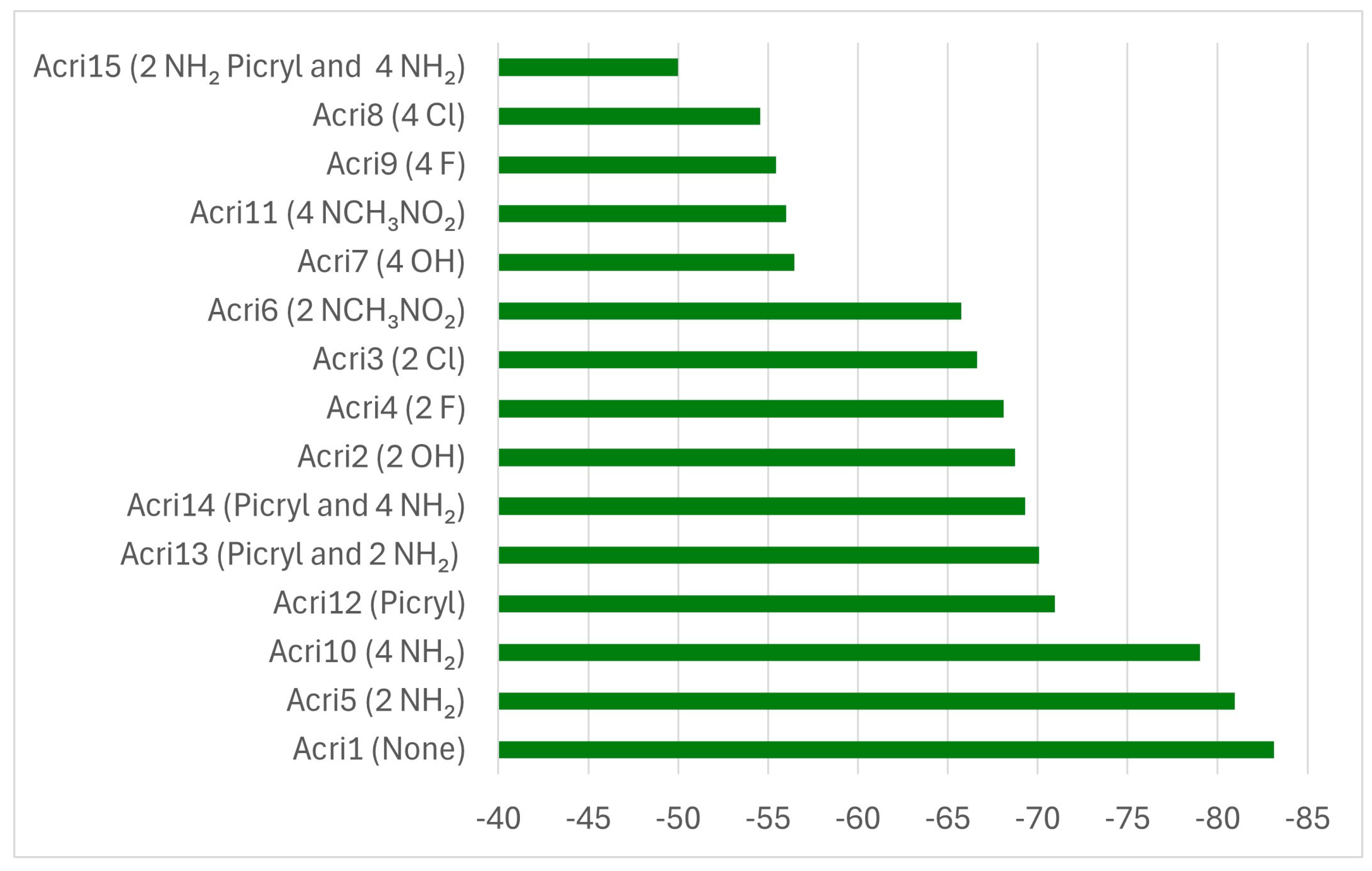 | Acri15 | 2 NH2 in Picryl and 4 NH2 | 7.02 | 6.79 | 7.52 |