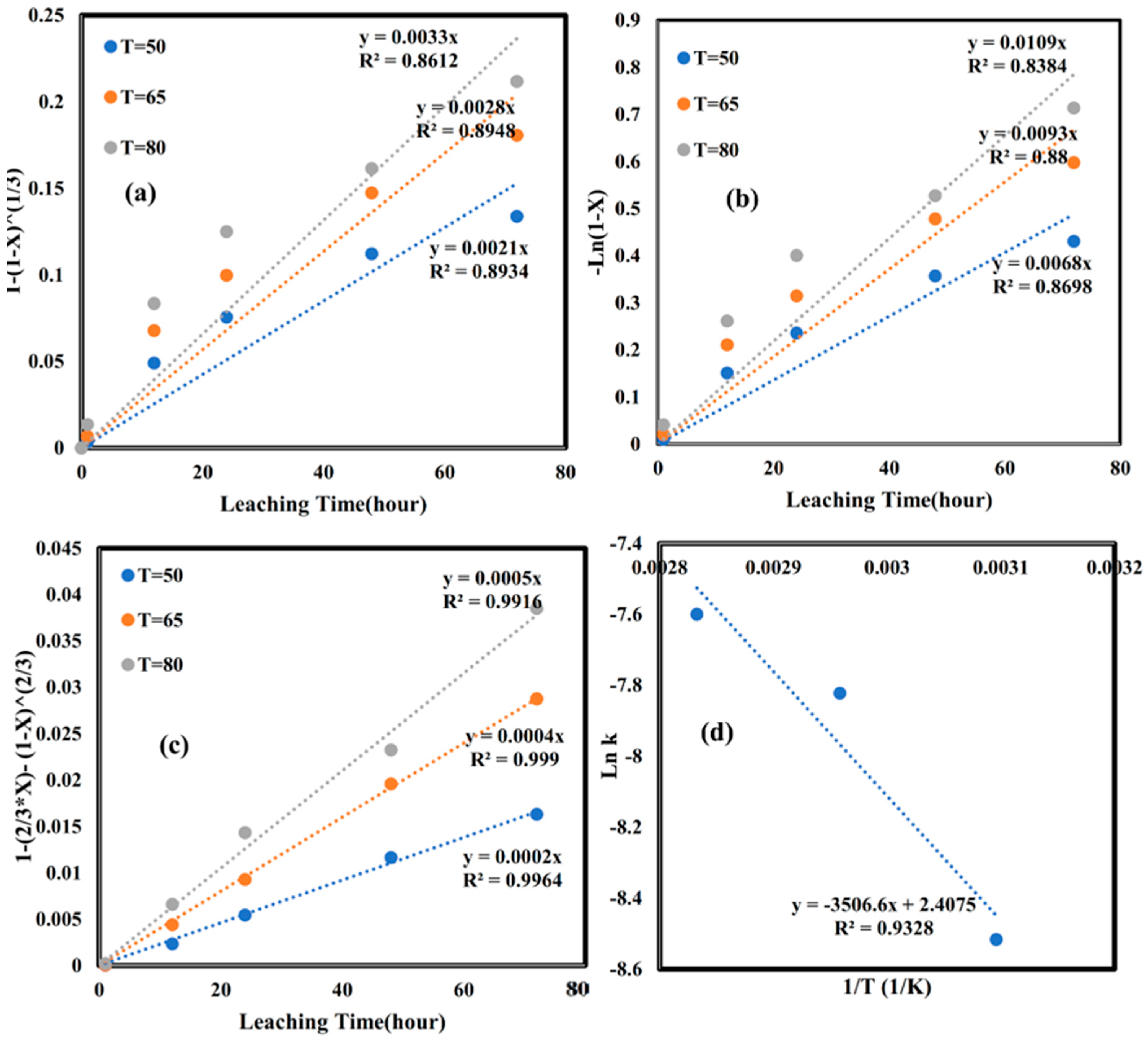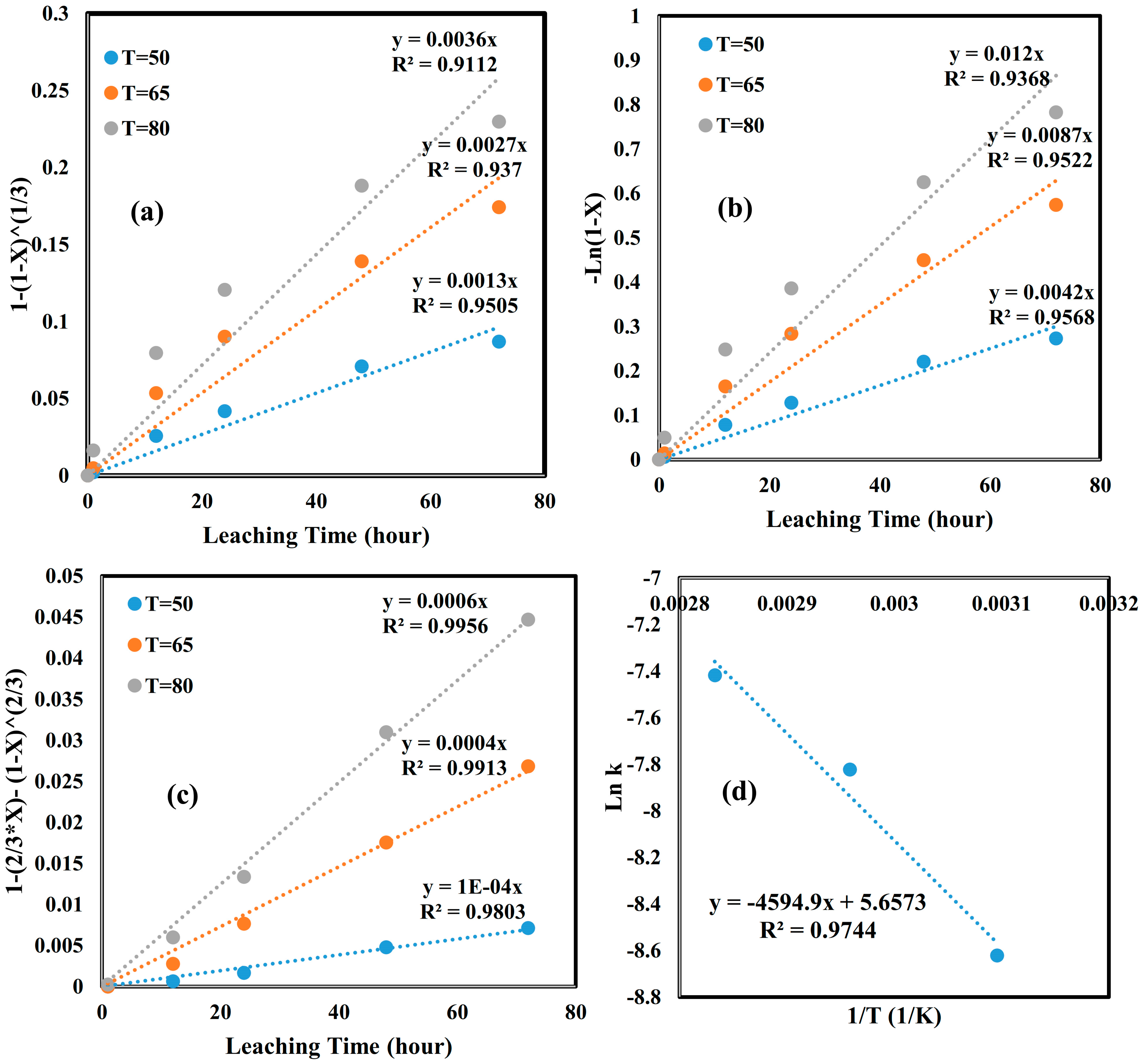 - Diffusion control model (Equation (5), Figure 5c): This model provided the best fit to the experimental data (with acceptable R2 values), suggesting that the reaction was controlled by ash layer diffusion.