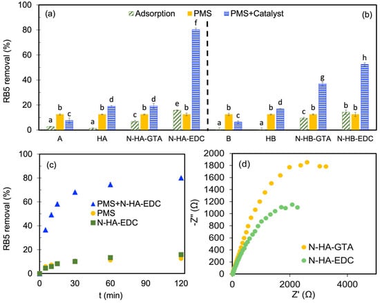 RB5 removal performance of synthesized and functionalized hydrochars: (a) raw material A and derivatives; (b) raw material B and derivatives after 2 h of treatment; (c) kinetic study of RB5 degradation by N-HA-EDC, PMS, and PMS + N-HA-EDC ([RB5] = 50 mg/L, [catalyst] = 0.1 g/L, [PMS] = 2 mM); (d) EIS comparison of N-HA-GTA and N-HA-EDC. Error bars represent standard deviation. Different letters denote statistically significant (Tukey, p < 0.05).
