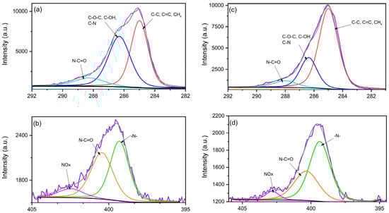 The surface chemical composition of the N-doped materials was assessed by XPS technology, and the intricate analysis results are presented in Figure 5 and Tables S5 and S6 in the Supplementary Materials. The N1s spectrum of N-HCs, as shown in Table S6, was deconvoluted into three distinct peaks: tertiary amino (399.3 eV), amide (400.2 eV), and nitrogen–oxygen species (402.04 eV), echoing the findings of He and colleagues [62] regarding the synthesis of a hyperbranched polyamine adsorbent for CO2 capture. The surface of N-HA-EDC is characterized by a more carbonaceous and aliphatic nature, potentially offering increased anchoring points for initiating a surface electronic conduction mechanism [63]. While N-HA-GTA exhibits a greater number of single-bond oxygen functional groups, in N-HA-EDC, oxygen is involved in forming carbonyl-type bonds. These bonds act as Lewis bases to initiate the radical pathway and to generate singlet oxygen (1O2) [63]. Accordingly, the XPS analysis not only corroborated the FTIR observations for both N-HCs but also affirmed the efficacy of the grafting technique employed in this study.