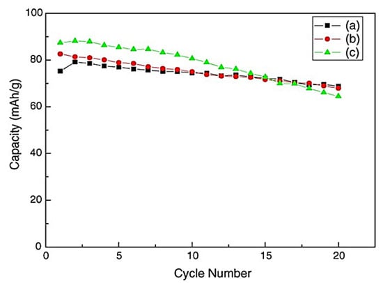 Figure 1. Capacity against cycle numbers for Na/NaV1−xCrxPO4F cells using 10 m/g of density and 3.0–4.5 V of voltage range: (a) NaV0.92Cr0.08PO4F; (b) NaV0.96Cr0.04PO4F; (c) NaVPO4F. Reprinted with permission from Ref. [16]. 2025, Mudhar A. Al-Obaidi.