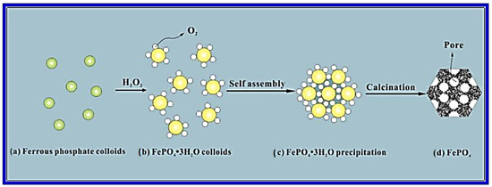 Figure 3. A representation of the creation method of the mesoporous FePO4 nano-spheres. Adapted with permission from Ref. [19]. 2025, Mudhar A. Al-Obaidi.