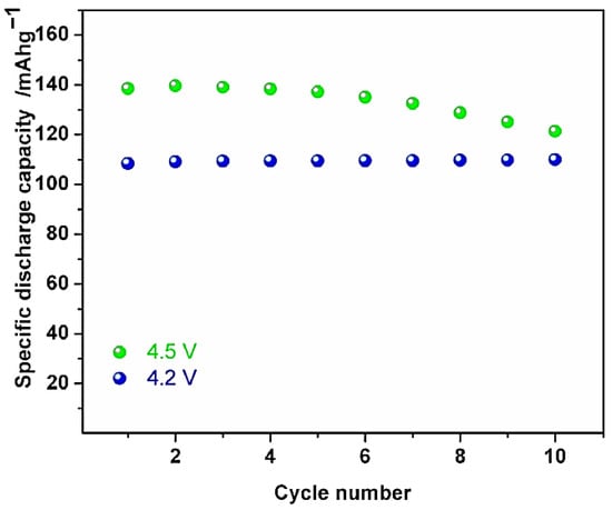 Figure 4. Specific discharge capacity against cycle number of Na2/3Co2/3Mn2/9Ni1/9O2 electrodes using 4.2 V and 4.5 V various upper cut-off voltages with 10 cycles of galvanostatic cycling at C/20. Reprinted with permission from Ref. [20]. 2025, Mudhar A. Al-Obaidi.
