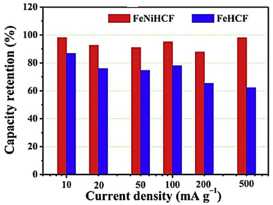 Figure 5. Capacity retention against current density of FeNiHCF and FeHCF. Reprinted with permission from Ref. [21]. 2025, Mudhar A. Al-Obaidi.