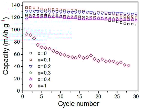 Figure 6. Capacity against cycle number of NaFex(Ni0.5Mn0.5)1−xO2 samples using 12 Ma/g (0.05 C) of the current rate. Reprinted with permission from Ref. [22]. 2025, Mudhar A. Al-Obaidi.