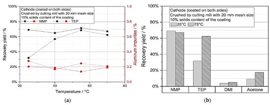Figure 8. (a) Recovery yield and aluminium impurities against temperature. (b) Comparison of recovery yield of Triethylphosphate (TEP), 2,5-dimethylisosorbide (DMI), and acetone (various green solvents) for direct cathode scrap recycling. N-Methyl-2-pyrrolidone (NMP) [29].