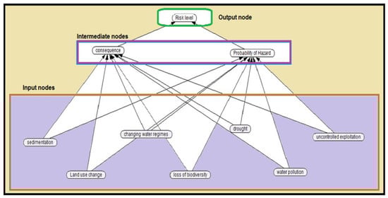 Recently, there has been increased interest in the use of graphical tools such as Bayesian networks (BNs) in natural resource modeling and management [20]. BN’s capabilities for accurate decision-making when complex multi-dimensional uncertainties exist in a system make it an ideal method for the assessment of risk levels in wetlands. BNs use two types of networks, namely Bayesian decision networks (BDNs) and Bayesian belief networks (BBNs). BBNs are an efficient and accurate tool for analyzing risk models, offering a pragmatic and scientifically credible approach for modeling complex systems where substantial uncertainties exist [21,22,23,24,25].