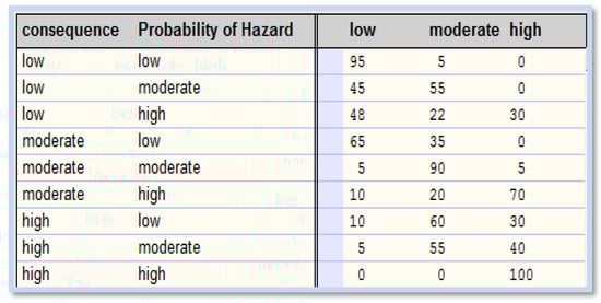 Following the completion of the ID setup, the states of each node were determined to form the initial BBN model. A range of states were considered for each node based on the data from expert judgments and the literature. Figure 4 illustrates the initial BBN developed to determine the levels of environmental risks at the SIWs. Once the network structure was completed, the probabilities of risk factors were entered into the network in the form of CPT codes for each node in the network. The quantitative relations between variables were modeled by the CPT associated with each node. The child node was assigned a probability for each possible combination of each parent state. The probability percentage values considered in the model were estimated based on expert judgments and background field study data from the SIWs. The BBN model developed for this study considers the states at each node. For instance, in the risk level node, three states (i.e., low, moderate, and high) are specified. The CPT of the risk level node is shown in Figure 5.