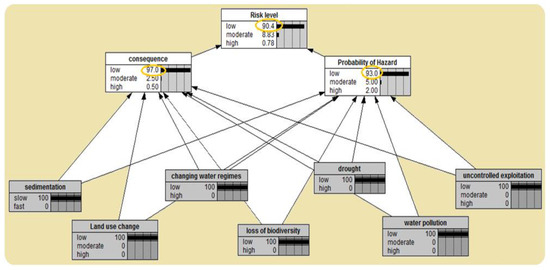 The risk level node is influenced by two nodes, including the probability of hazards and consequences. By combining the states of the nodes in BBN, several scenarios for the risk level node are considered. The probability distribution obtained from the output node (risk level) indicates that the risk level is very high for the SIWs (Figure 6). The results show that the risk levels for the SIWs are about 10%, 17%, and 73%, respectively, for the low, moderate, and high states (Figure 6). The results shown in Figure 6 highlight the drought as the highest (or fastest) state of risk for the SIWs, with 75%, followed by sedimentation (60%), loss of biodiversity (60%), changing water regimes (55%), uncontrolled exploitation (38%), land use change (37.5%), and water pollution (17.8%).