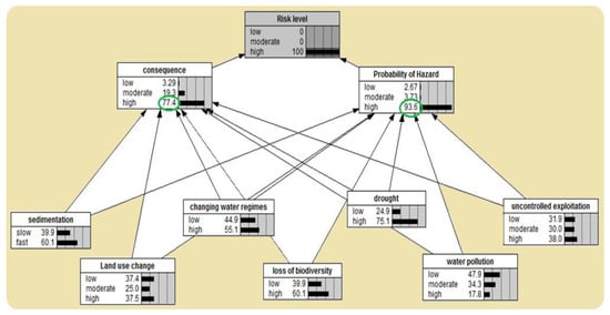 Figure 8 presents the diagnostic model for determining the environmental risk levels of the SIWs. For this model, in the risk level node, the high state was assumed to be 100%, so the probability of hazards and consequences in the high state were increased to 93.6% and 77.4%, respectively. According to the results of the sensitivity analysis shown in Table 2, the probability of hazard has a greater impact on the level of risk. The results highlight that, among the risk factors, drought has a greater effect on the environmental risk levels of the SIWs.