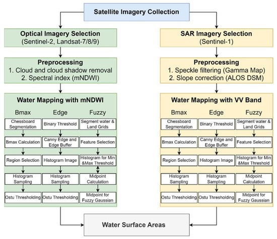 In this research, the satellite-based surface water mapping assessment was performed using the modified toolsets from Hydrologic Remote Sensing Analysis for Floods (HYDRAFloods: https://github.com/Servir-Mekong/hydra-floods/tree/master/hydrafloods, accessed on 1 May 2022). HYDRAFloods is an open source Python framework for obtaining, processing, and generating surface water maps assessed from both optical (e.g., Landsat-7/8/9) and SAR (Sentinel-1) satellite remote sensing images. The framework is developed and deployed on the GEE and Google Cloud Platform (GCP), which provide automated, rapid, and high-quality surface water mapping products to the users with minimal effort. In this study, the data downloading, image processing, water surface detection, data visualization, and analysis were carried out on top of Earth Engine Python API. The results were computed in GCP and evaluated in the GEE integrative interface. Figure 4 outlines the workflow of the water surface detection using HYDRAFloods, where details of image preprocessing and water mapping algorithms are introduced in the following sections.