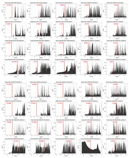 Additionally, the histogram of the sampling and the identified threshold values are presented in Figure 6. While some of the satellite images (e.g., Landsat-9 on 1 January 2022) show similar distributions in the histograms among different algorithms, most of the histograms are dissimilar, resulting in different threshold values. The results from Figure 5 and Figure 6 are summarized in Table 3. It is noted that the midpoint threshold values by the Fuzzy Otsu algorithm are calculated as the arithmetic mean of the “Max” and “Min” values. Additional information on the threshold values for each Otsu algorithm is also included. Among the Otsu algorithms for the same dates, the SAR image (i.e., Sentinel-1) shows a pattern of Edge > Bmax > Fuzzy for both water surface area and threshold values, while for the optical image (e.g., Landsat-7, -8, and -9), a pattern Fuzzy > Bmax > Edge is shown regarding the threshold values, and Fuzzy > Edge > Bmax is shown concerning the water areas. For the Sentinel-2 images affected by the cloud contamination, the Fuzzy surface areas are found to be less than those from Edge and Bmax algorithms. For the same algorithm among different dates, the threshold also varies based on the inundation areas: (1) SAR Sentinel-1 images show the lowest threshold values in no flood (22 December 2021, 3 January 2022), lower values in less flooded (15 January 2022), and highest value in most flooded (27 January 2022) conditions; and (2) optical images from Landsat-7/8/9 and Sentinel-2 images also show higher threshold values in flooded condition than less flooded conditions.