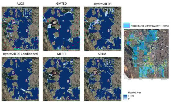 Flood water surface maps based on the FwDET-GEE algorithm from multiple DEM sources (ALOS, GMTED, HydroSHEDS, HydroSHEDS conditioned, MERIT, and SRTM), with flood reference map included, with flooded areas indicated by A, B, C and D.