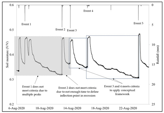Storm event selection for the framework depends upon the soil moisture profile that results from a storm event that shows full recovery (refer to Figure 1), which is defined when the pre-storm moisture is reached on the recession limb during post-storm conditions. For the storm events analyzed in this work, there were three required criteria: 1. a noticeable response/rise in soil moisture from a pre-storm condition to saturation; 2. a single peak in soil moisture; and 3. enough time and decrease in soil moisture to return to the pre-storm condition. To exemplify this process, several storm events occurring in August of 2020 at the bioswale site are shown in Figure 3. If a minimal amount of rain occurred between events (such as seen between the time between event 4 and event 5 in Figure 3), it must be such that there is no significant increase in soil moisture. While doing so, 69 percent (58 out of 84) of storm events met the criteria for the framework development. The pre-storm soil moisture condition (right before the soil moisture peaks) is not the same value for every storm event (see black dots in Figure 3) as they vary over time and with interevent time for this process. Typically, there are higher pre-storm soil moisture values during cold seasons and lower pre-storm soil moisture values during warm seasons due to temperature dependence [20].