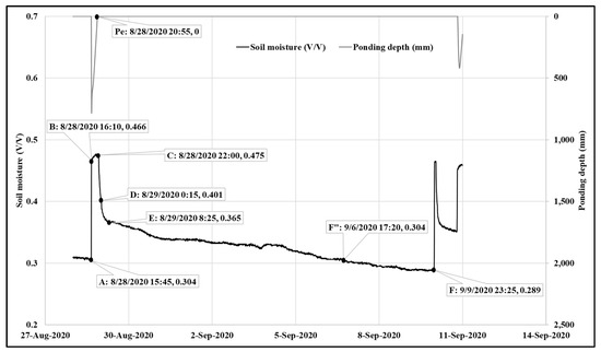 To understand if the recession based on the 10 cm depth of the downstream bioswale (i.e., 4 days) is indicative of recovery, the results from two SRT performed 4 days apart (14 September 2020 and 18 September 2020) at the bioswale are compared (Figure 11). The SRT is the process where inflow is artificially introduced to the bioswale until the soil is completely saturated and outflow is observed at the outlet, which allows for the influence of storm-based variabilities to be excluded. Initial moisture conditions for both SRTs were similar (0.41 v/v and 0.42 v/v for 14 September and 18 September, respectively—Figure 11). Although by the definition of the framework, this is not fully recovered in between the time, it was close enough to validate that the time of 3.5 days (between point C and F in the framework) was approximately enough for the site to recover between tests similar to the four-day average indicated by the framework. After the second SRT, it took less than three days for the system to recover (i.e., recess to its pre-storm condition) based on the 10 cm depth. After the SRTs, a storm event of 18 mm depth occurred on 26 September 2020, 8 days after the second SRT. Point F for this storm is defined at 0.28 v/v, demonstrating the dependency of the pre-storm condition in the framework. Overall, the back-to-back SRTs also demonstrate that downstream bioswale performed well qualitatively.