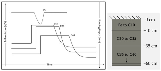 Conceptual representation of soil moisture sensors response to a rainfall at multiple depths within the soil column (left) and sketch of soil column.